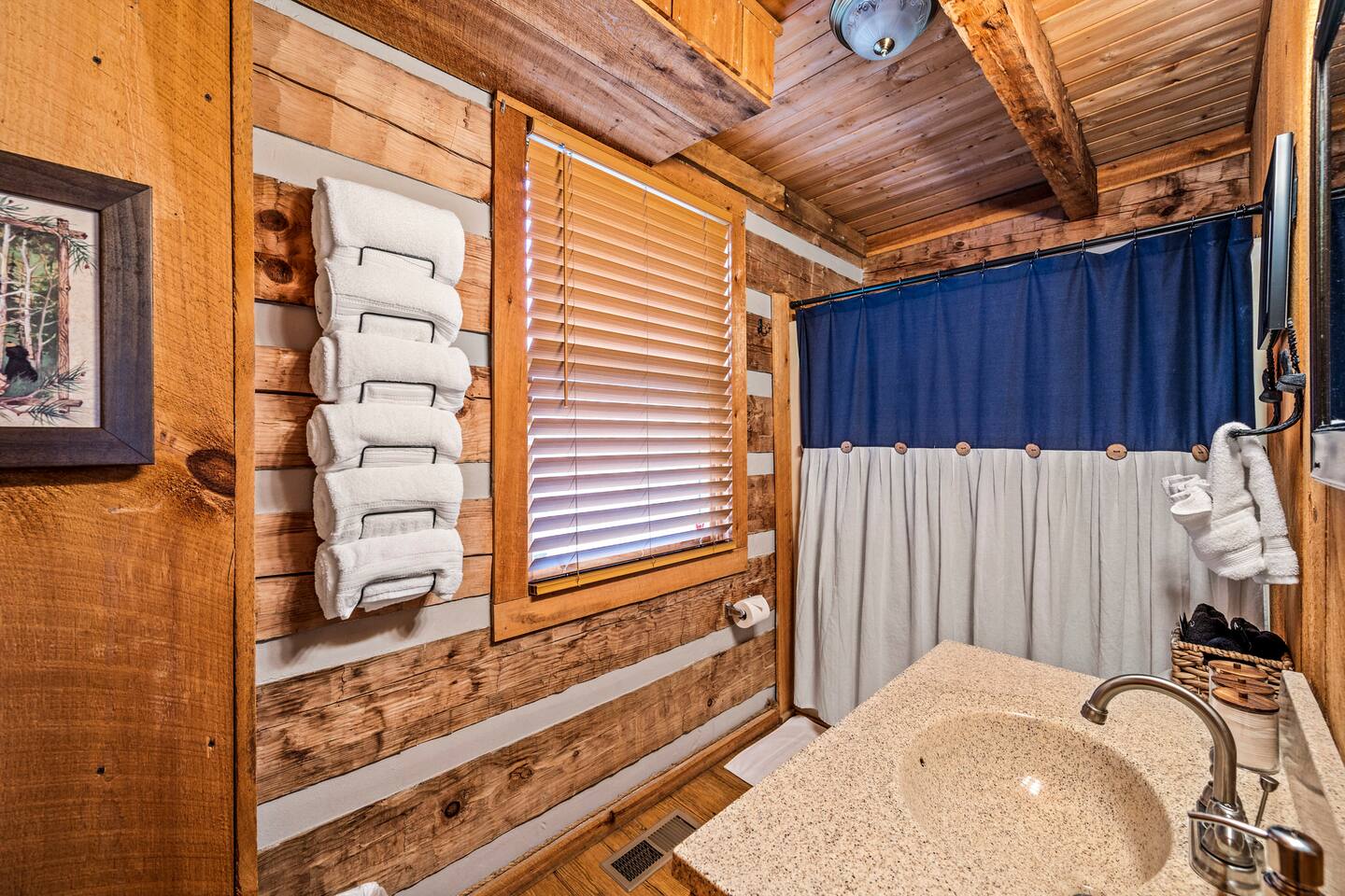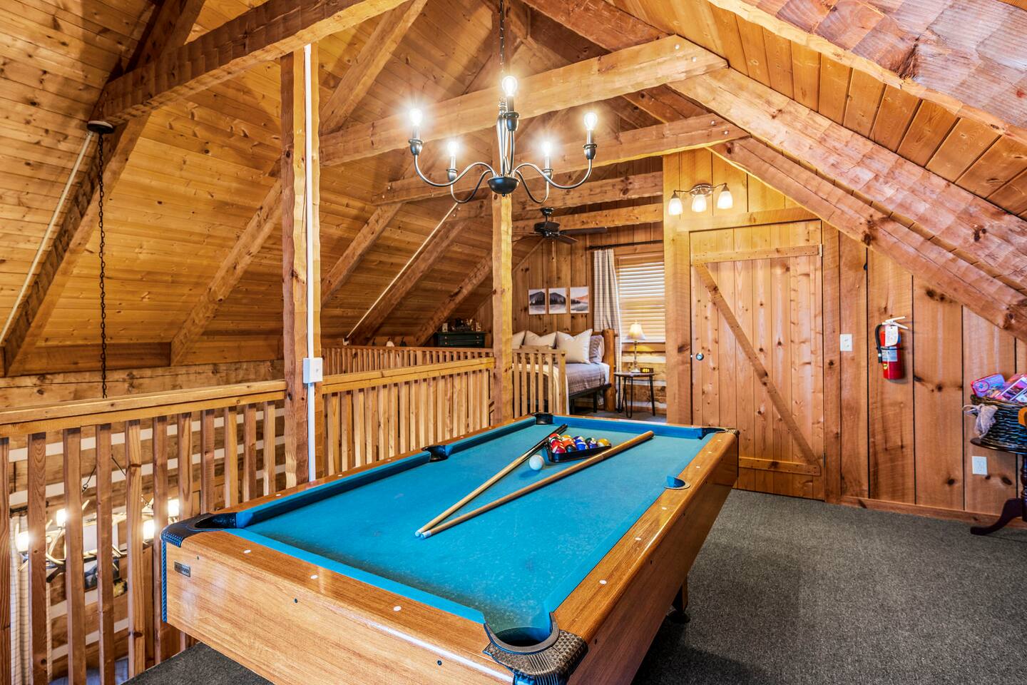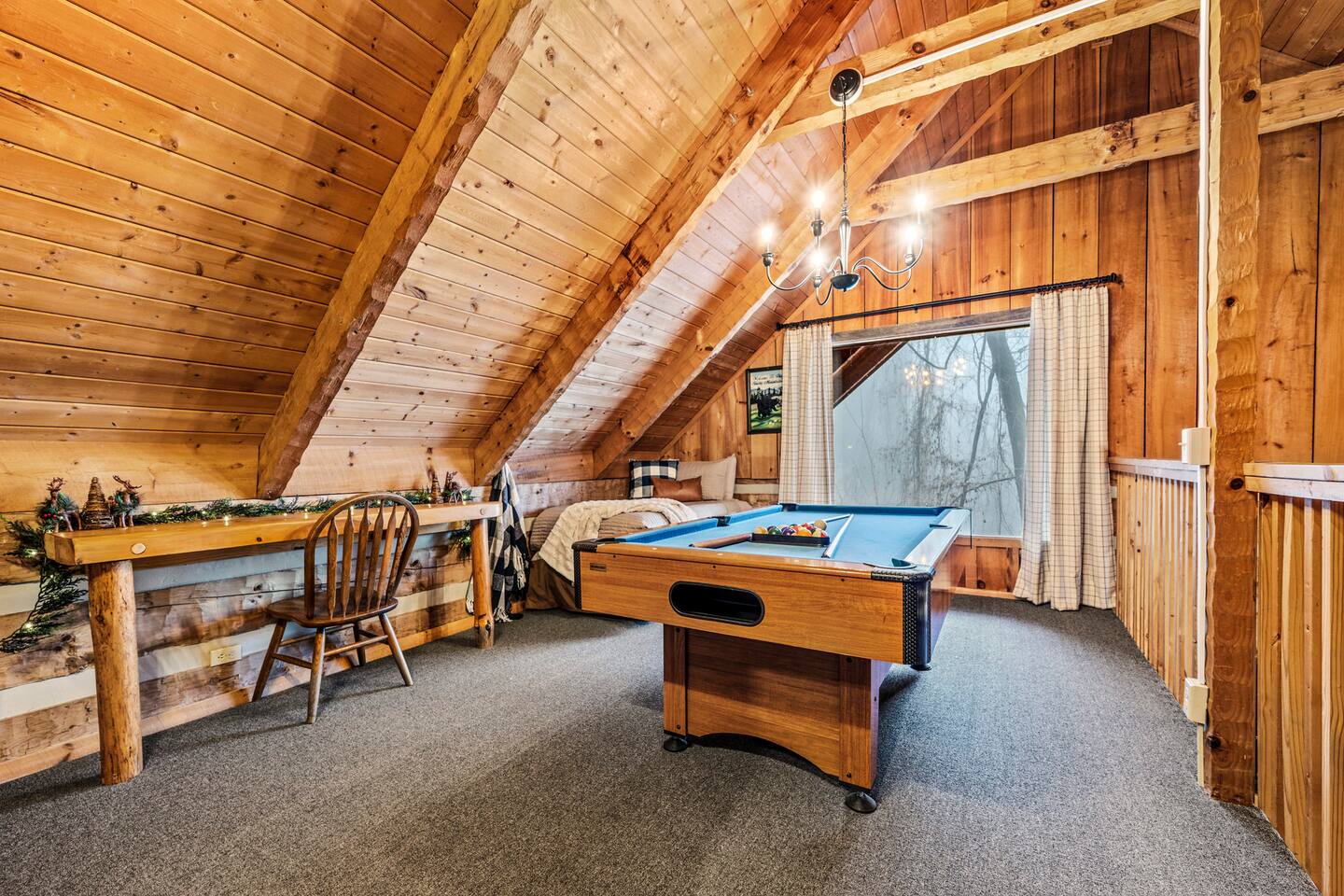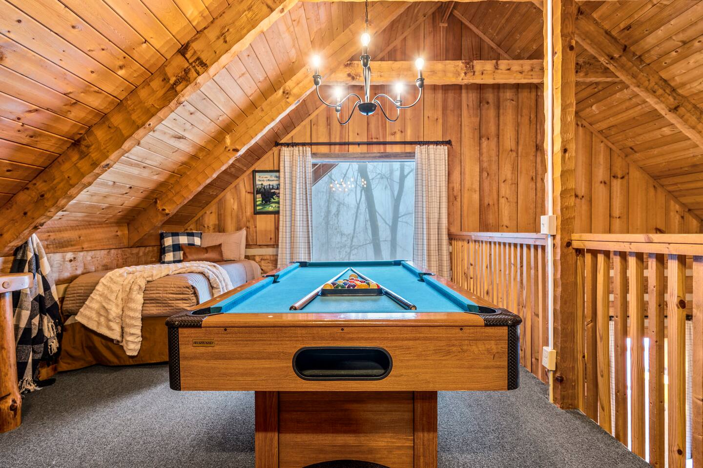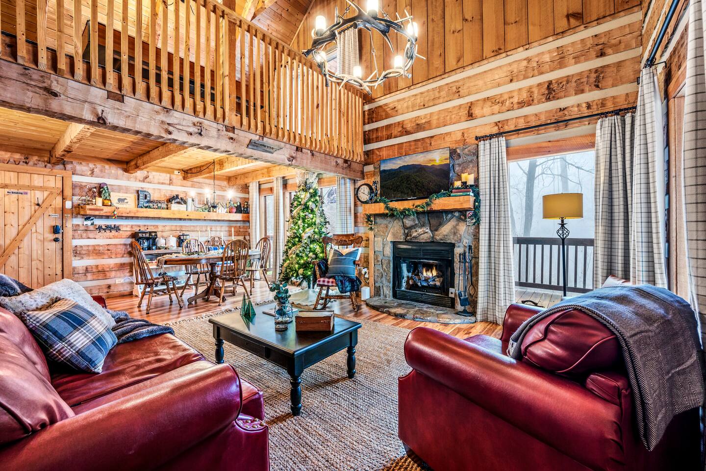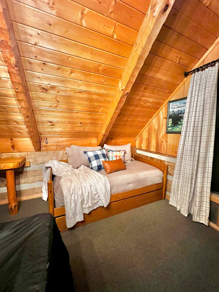 Our mountain side cabin offers many amenities including: • Hot tub on back porch overlooking downtown Pigeon Forge • Pool table in loft area • Fully stocked coffee bar for drip, pour over or pods, espresso machine, w/ coffee grounds, coffee beans, k-cups & individually packaged cream & sugar • Roku TVs w/ Hulu live & Disney+ stream access for movies & sports • Vintage board game classics: Scrabble, Monopoly, Clue, Sorry & Yahtzee, & chess/checkers set. • Gas log fireplace w/ timer switching