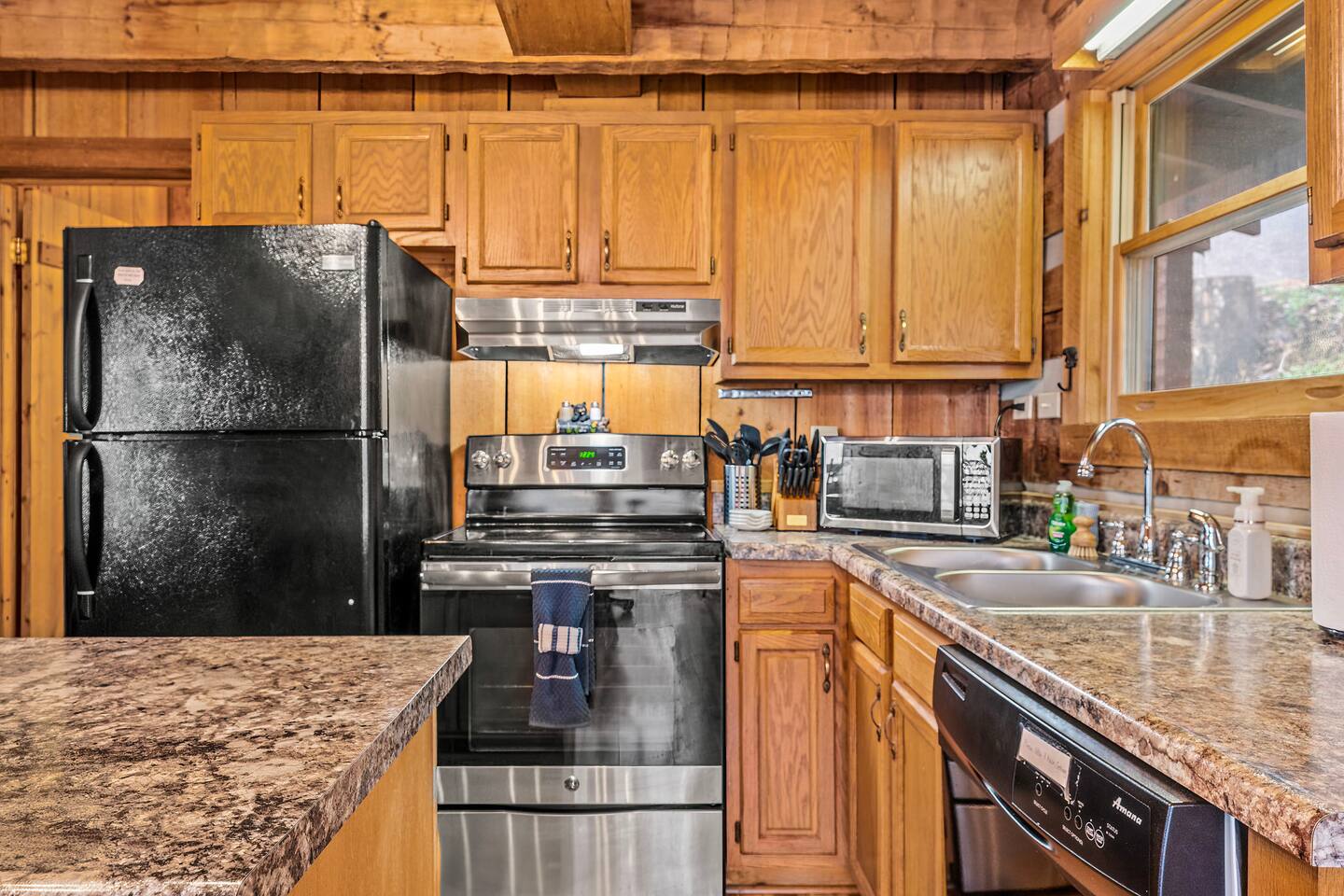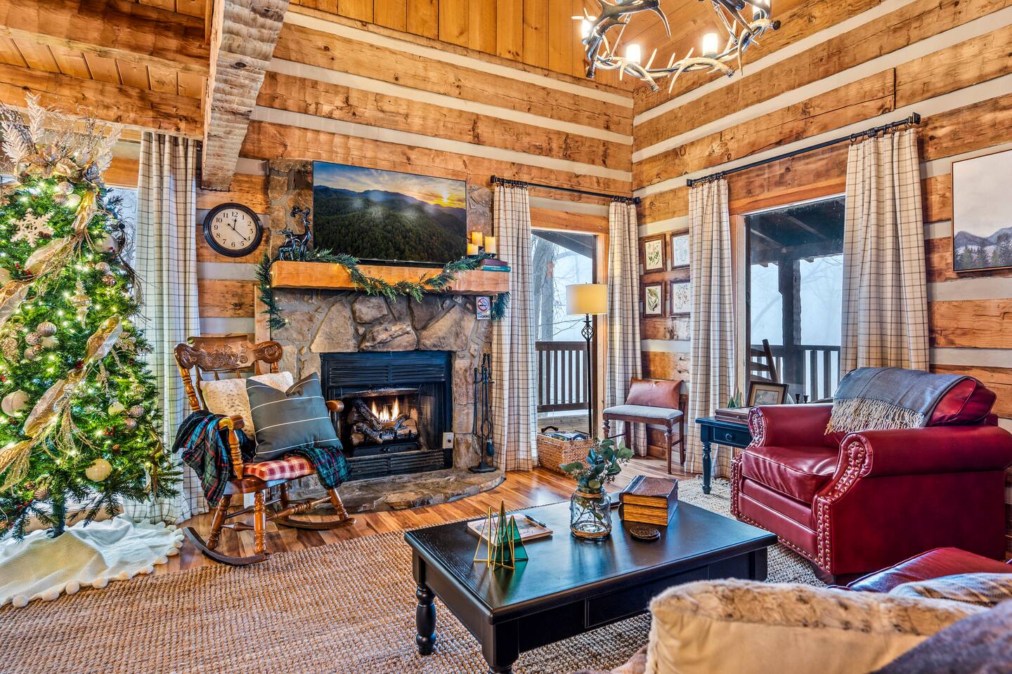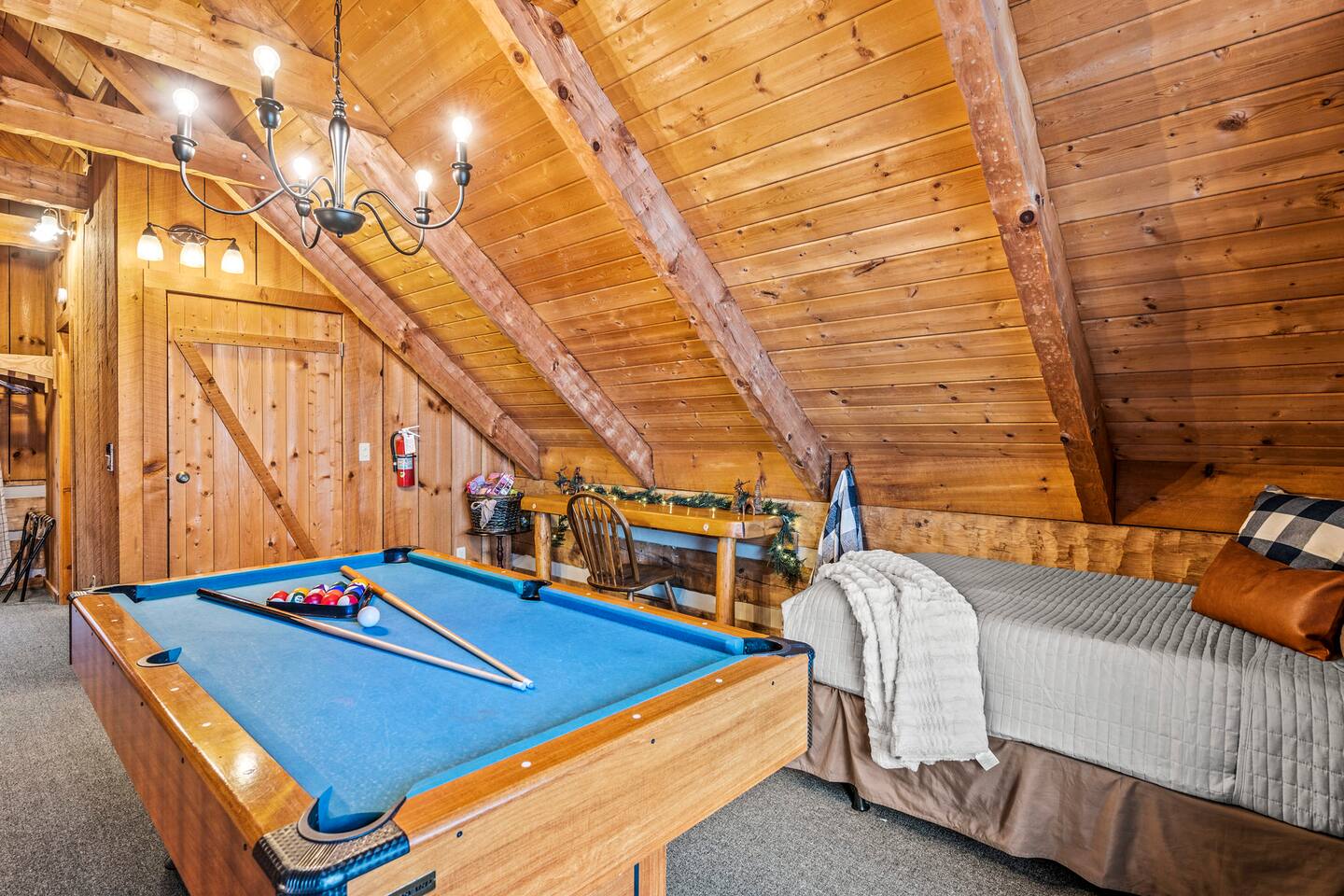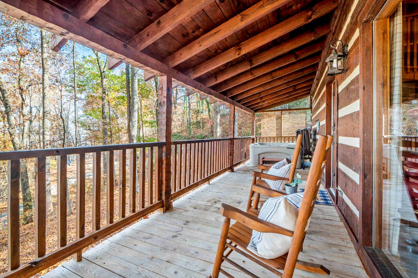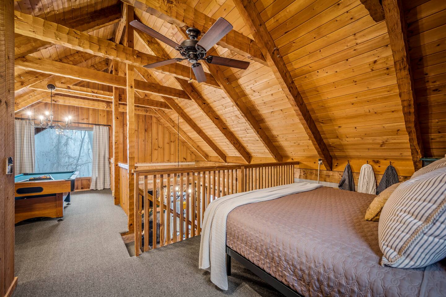 Our mountain side cabin offers many amenities including: • Hot tub on back porch overlooking downtown Pigeon Forge • Pool table in loft area • Fully stocked coffee bar for drip, pour over or pods, espresso machine, w/ coffee grounds, coffee beans, k-cups & individually packaged cream & sugar • Roku TVs w/ Hulu live & Disney+ stream access for movies & sports • Vintage board game classics: Scrabble, Monopoly, Clue, Sorry & Yahtzee, & chess/checkers set. • Gas log fireplace w/ timer switching