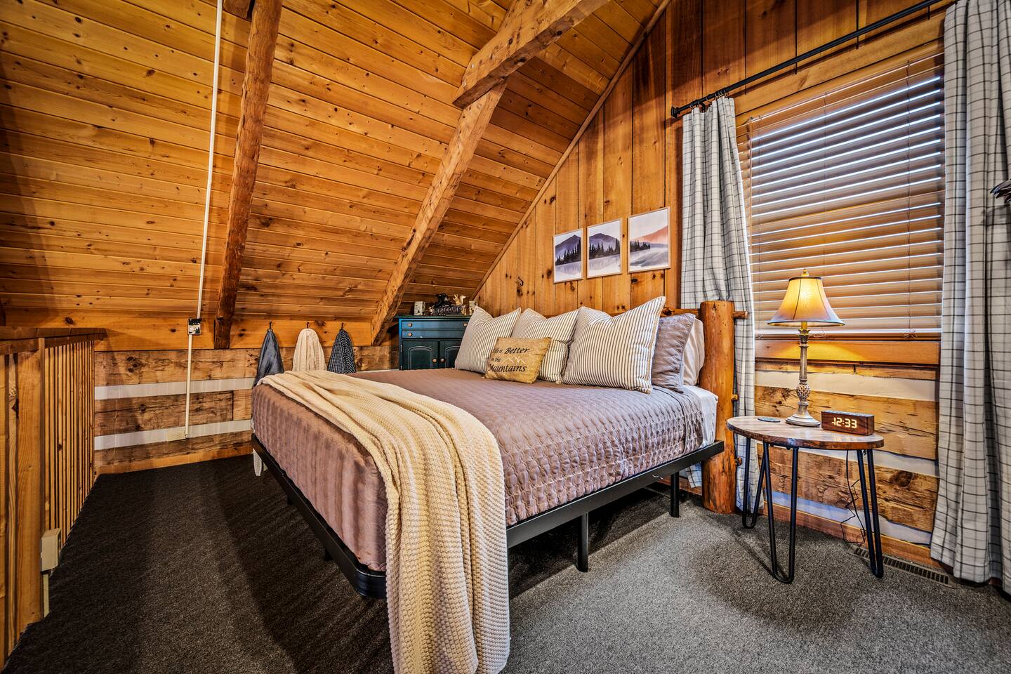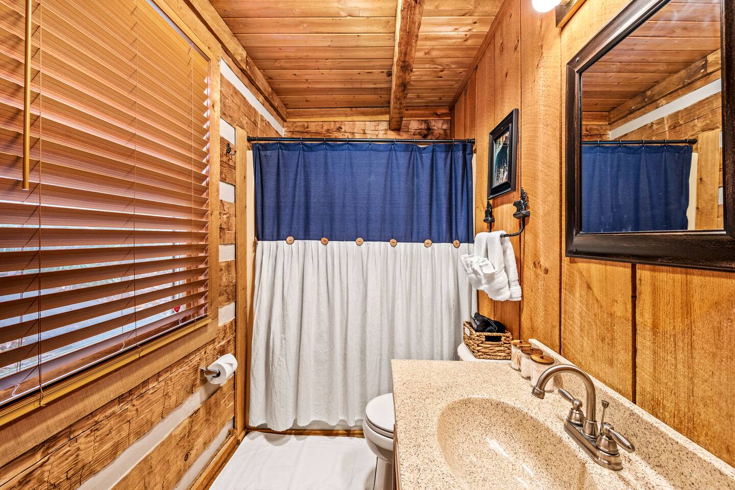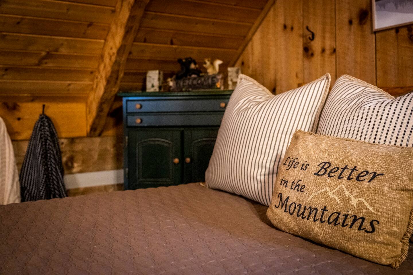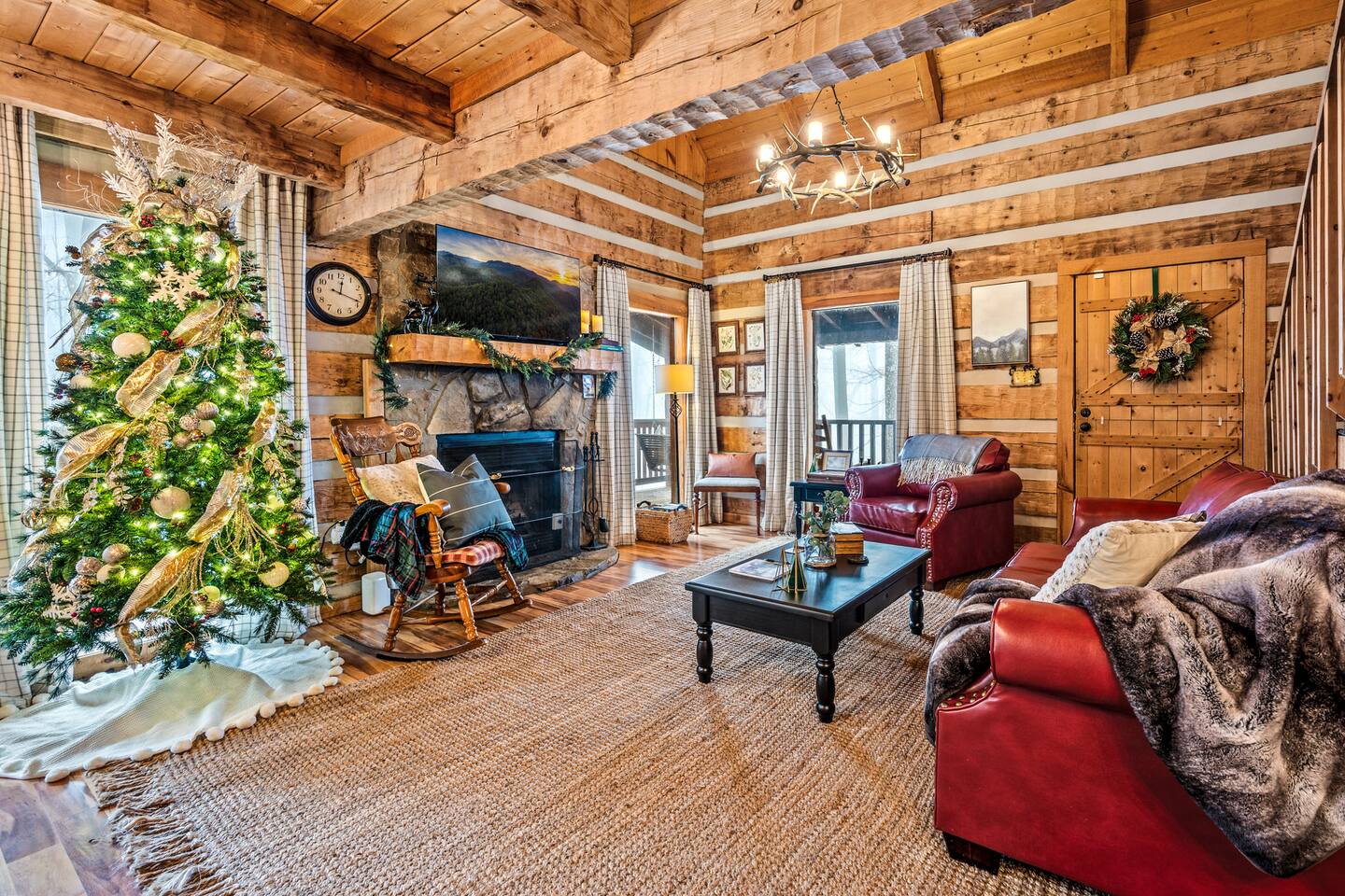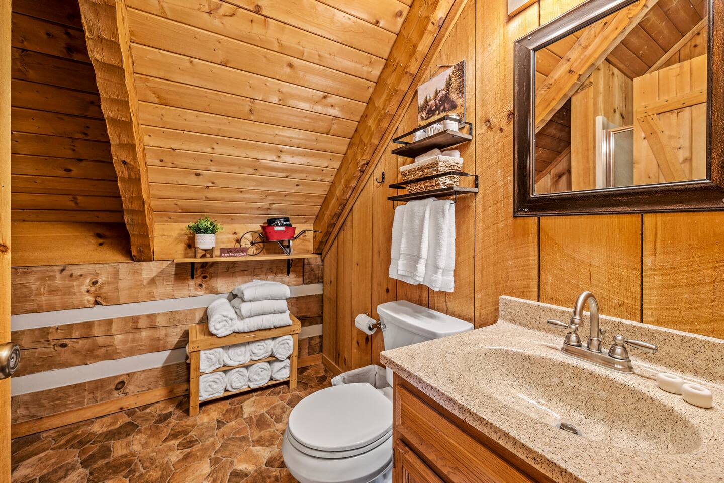 Our mountain side cabin offers many amenities including: • Hot tub on back porch overlooking downtown Pigeon Forge • Pool table in loft area • Fully stocked coffee bar for drip, pour over or pods, espresso machine, w/ coffee grounds, coffee beans, k-cups & individually packaged cream & sugar • Roku TVs w/ Hulu live & Disney+ stream access for movies & sports • Vintage board game classics: Scrabble, Monopoly, Clue, Sorry & Yahtzee, & chess/checkers set. • Gas log fireplace w/ timer switching